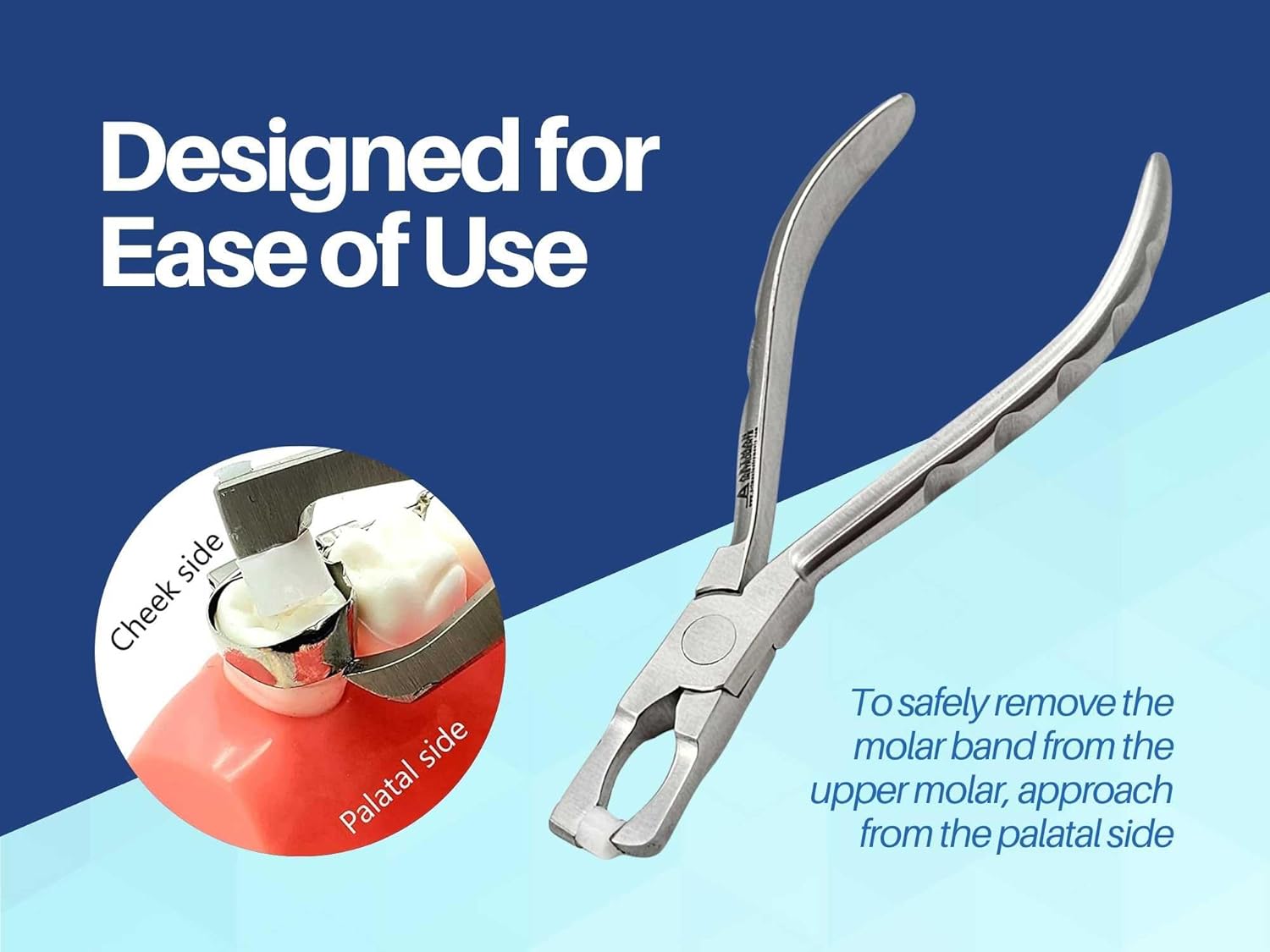 Now you can remove your molar bands in minutes with these pliers.Procedure When you are removing the metal band of the lower first molar, put the white plastic part of the pliers on the chewing surface of the tooth and engage the edge of the other part under the metal band at the gum side. Once it is engaged, simply press the pliers and the band will be out.We recommend you watch the video before attempting it.Please note: For the lower molars, approach the tooth from the cheek side of the tooth, and for the Upper molar teeth approach from the palatal side. This will make your job a lot easy. The leftover cement can be removed with our other pliers named adhesive removing pliers