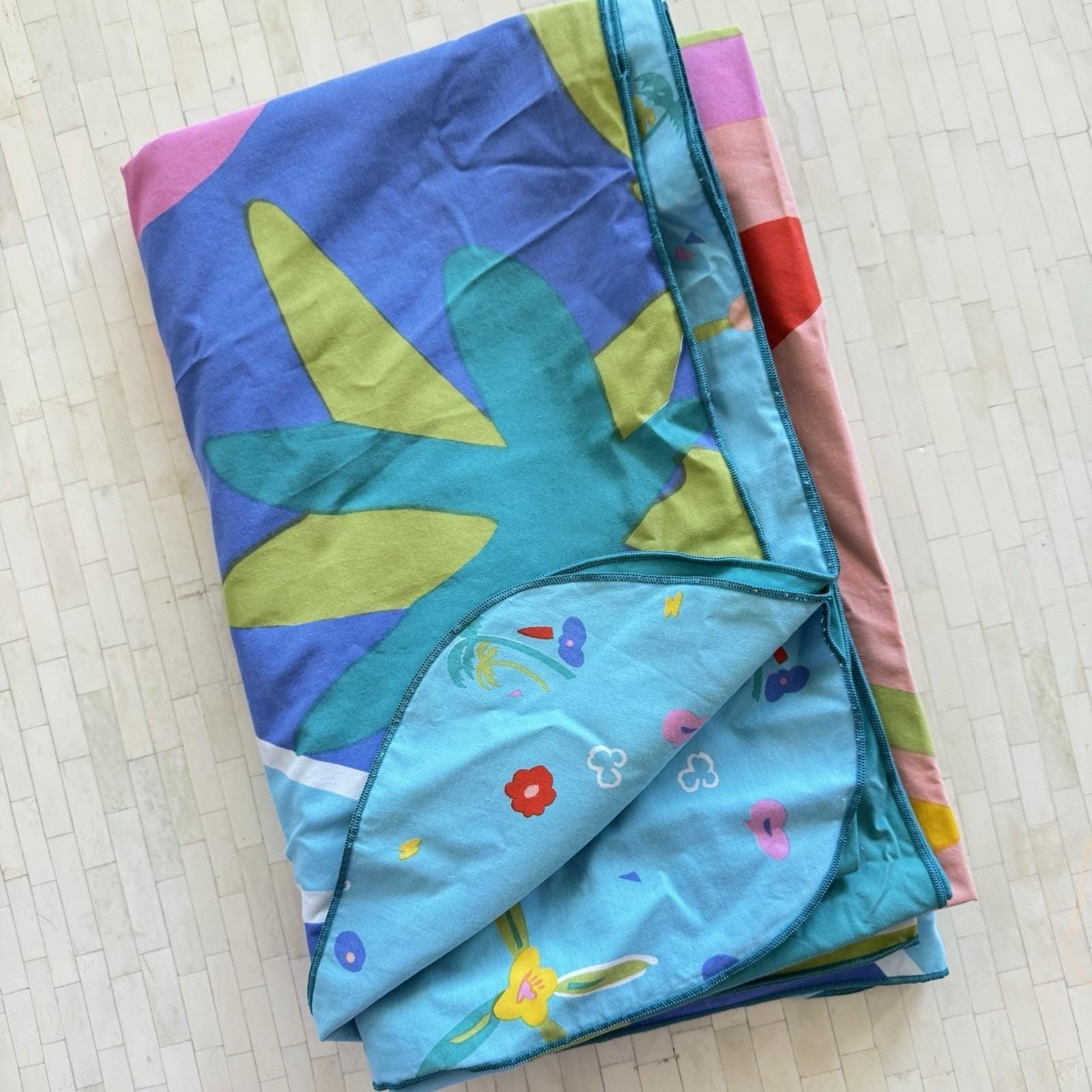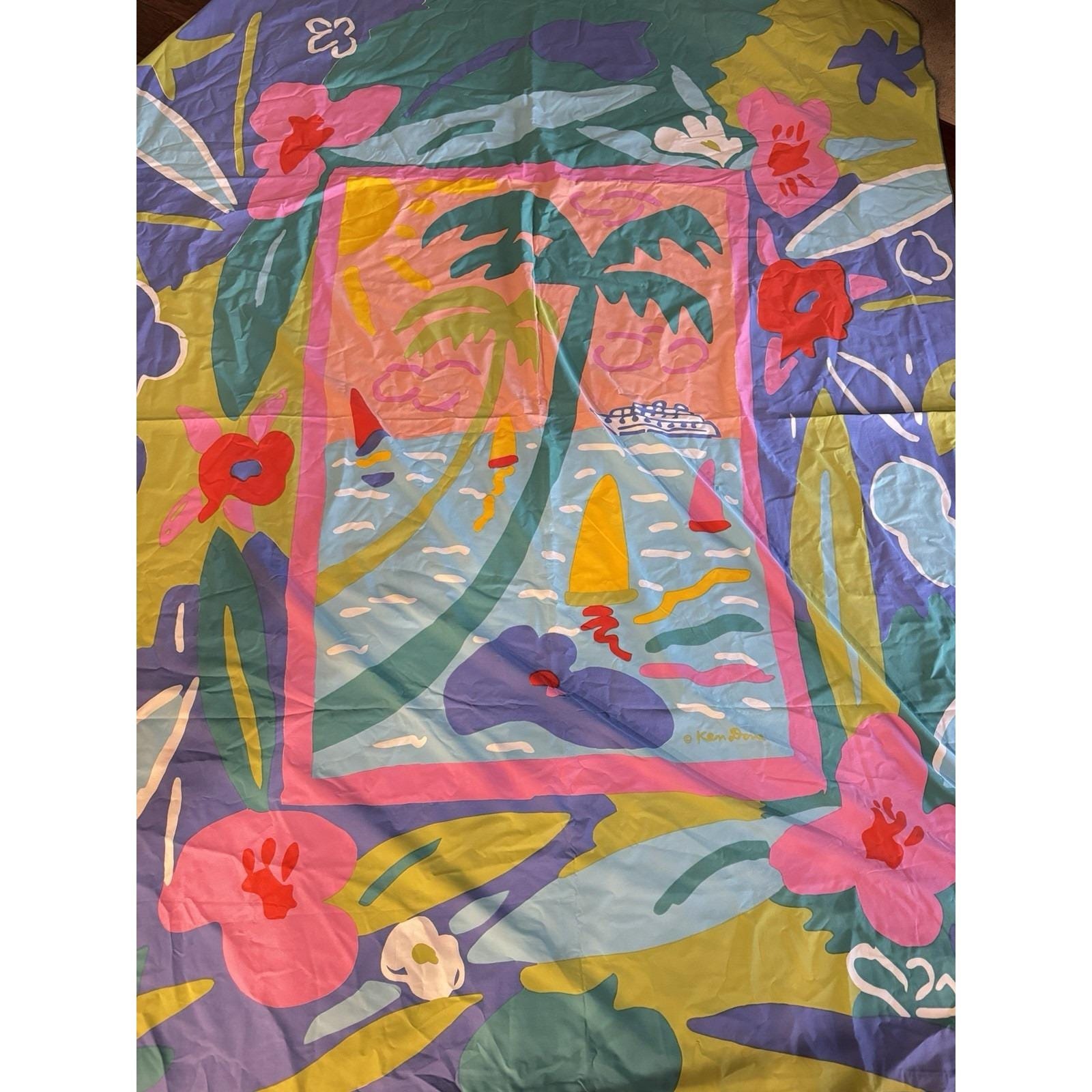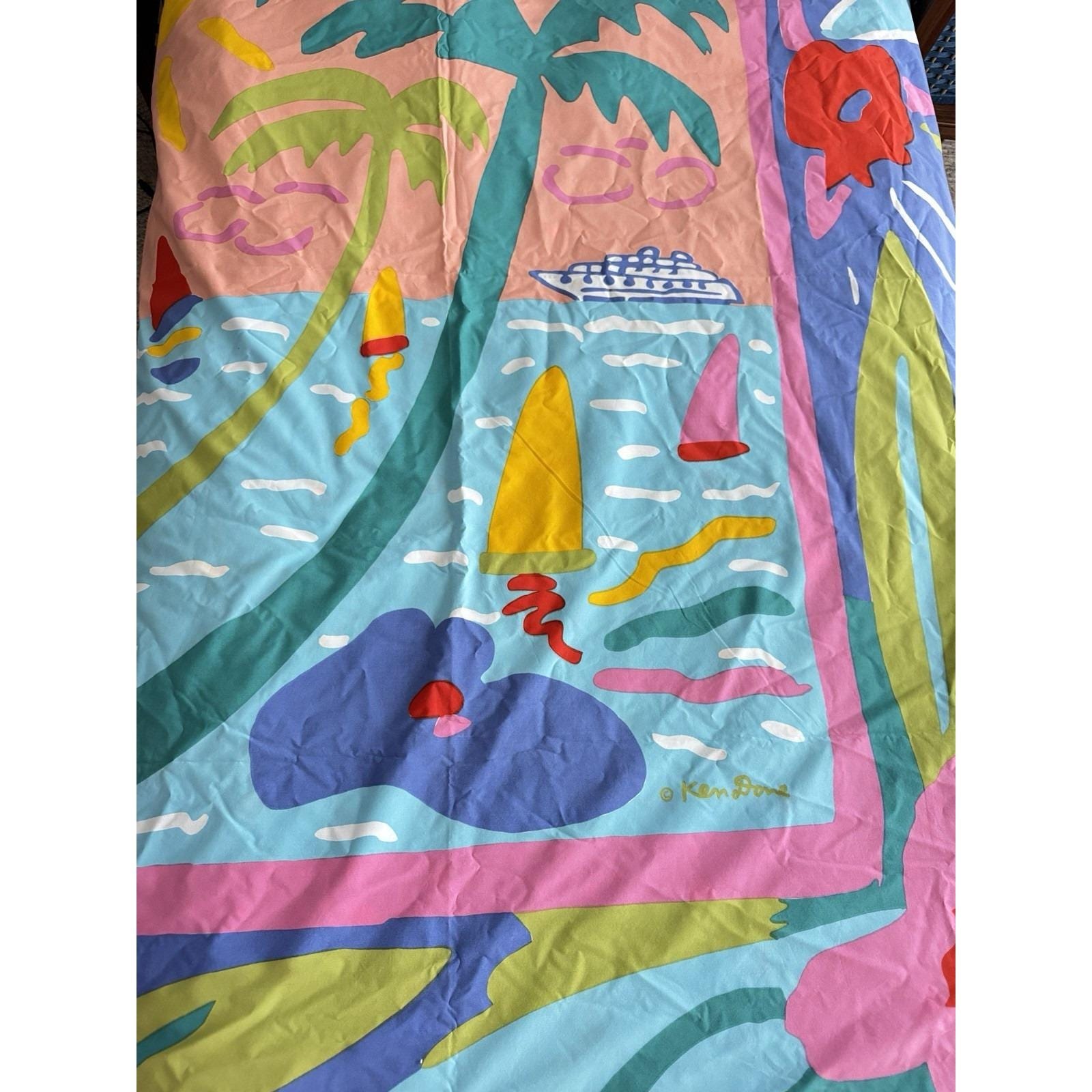 This is so hard to find! Beautiful, turquoise, blue pinks, purple, fun, retro print with hibiscus flowers, palm tree, and sailboats! Great condition feels very crispy almost new no holes/stains that I can see. Smoke free.