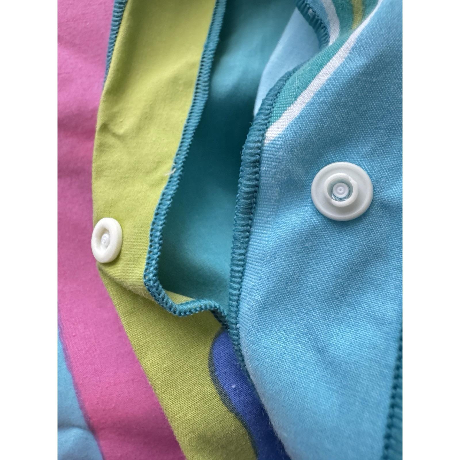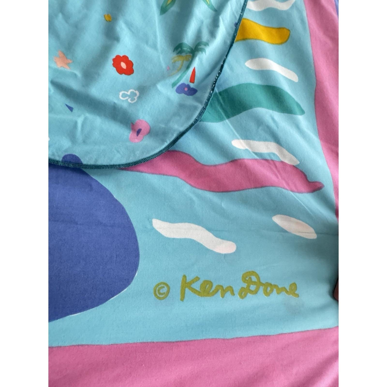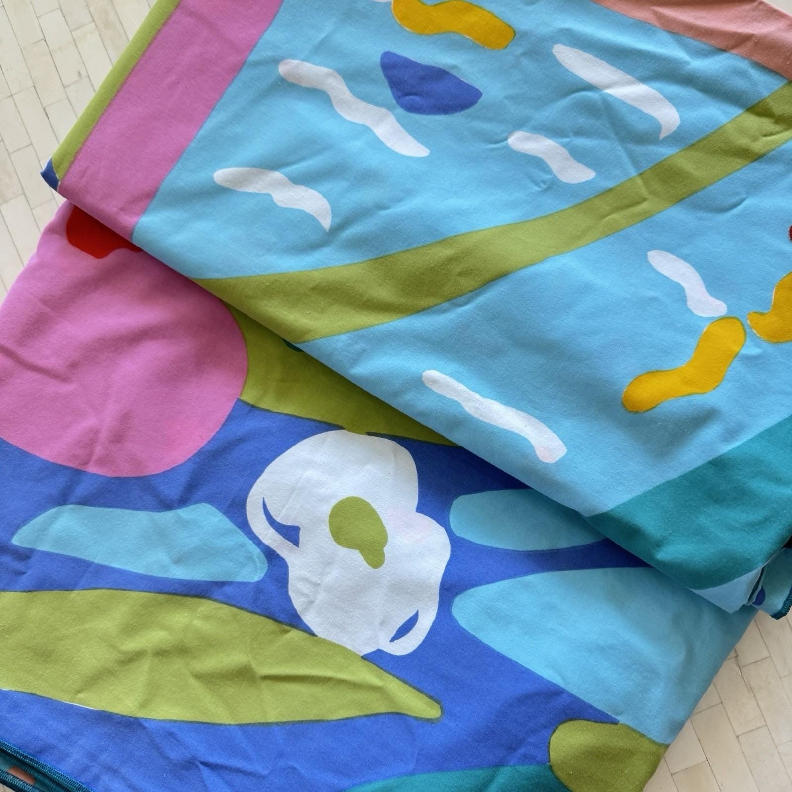 This is so hard to find! Beautiful, turquoise, blue pinks, purple, fun, retro print with hibiscus flowers, palm tree, and sailboats! Great condition feels very crispy almost new no holes/stains that I can see. Smoke free.